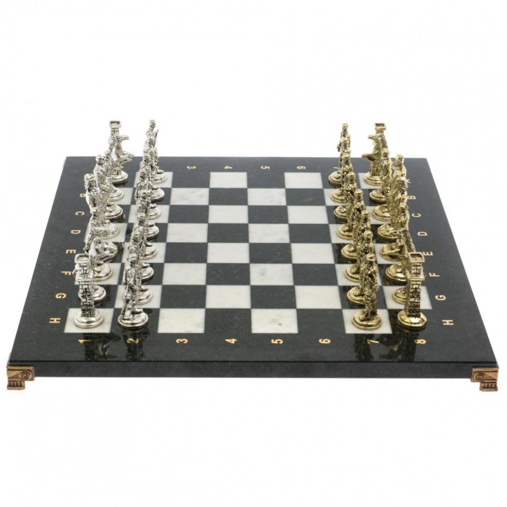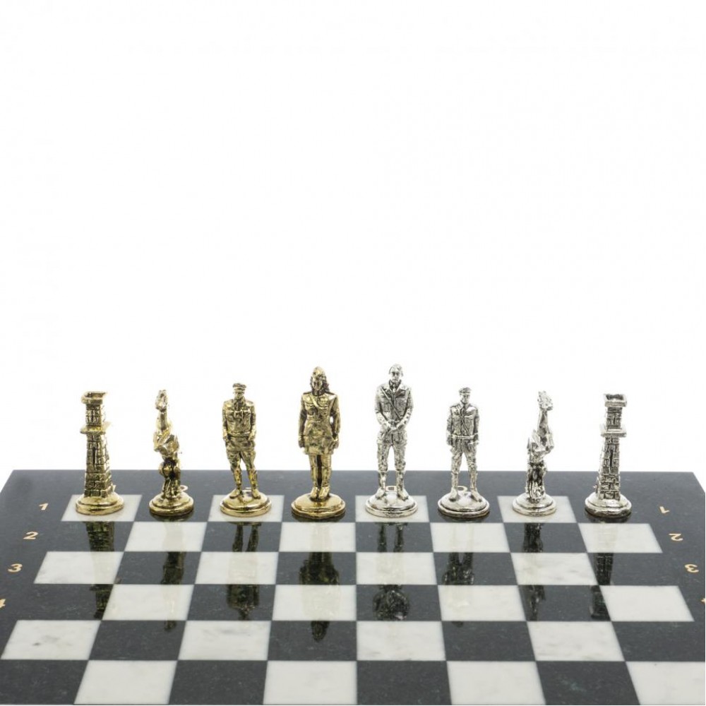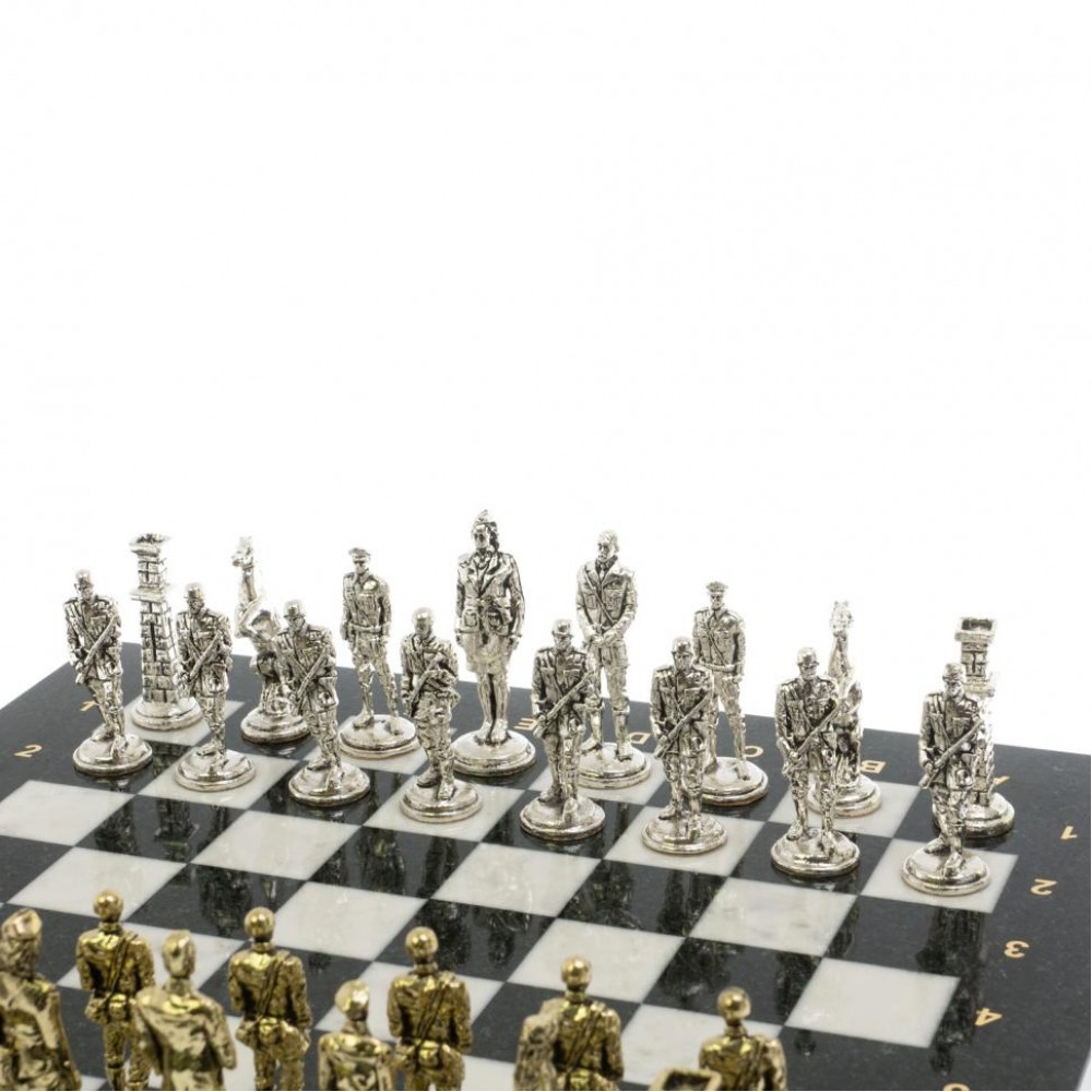 Эксклюзивные исторические шахматы – новинка в нашем интернет-магазине. Шахматные фигуры в золотом цвете – советские войска во главе Иосифом Сталиным, с другой стороны в серебряном цвете – немецкие войска во главе с Адольфом Гитлером. Фигуры из металла с высокой степенью детализации игровых персонажей. Доска изготовлена из натурального змеевика и мрамора. В комплекте подарочный кейс.