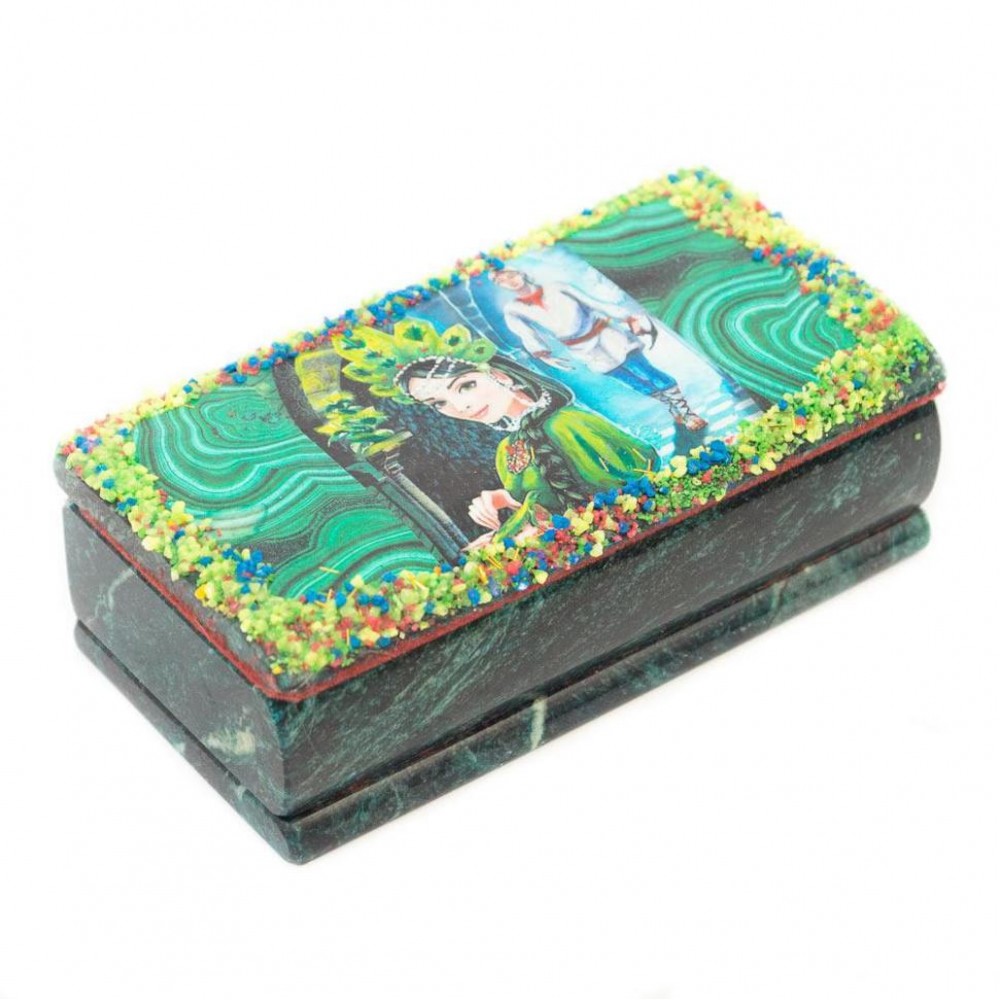 Шкатулка изготовлена вручную из змеевика, каменная крошка, имеет размеры 14х7х5 см и весит 750 г.