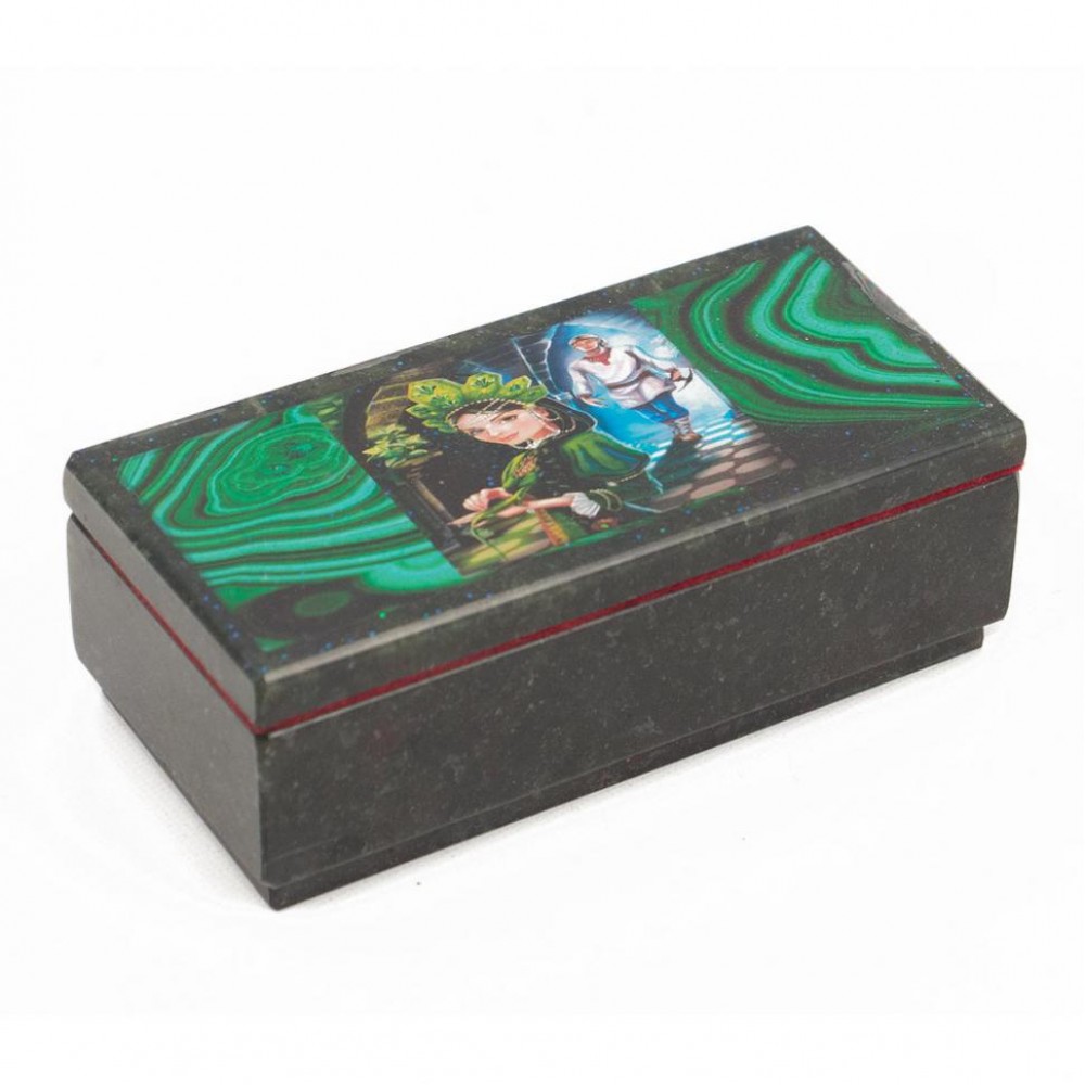 Шкатулка выполнена вручную из змеевика, каменная крошка, имеет размеры 14х7х5 см и весит 730 г.