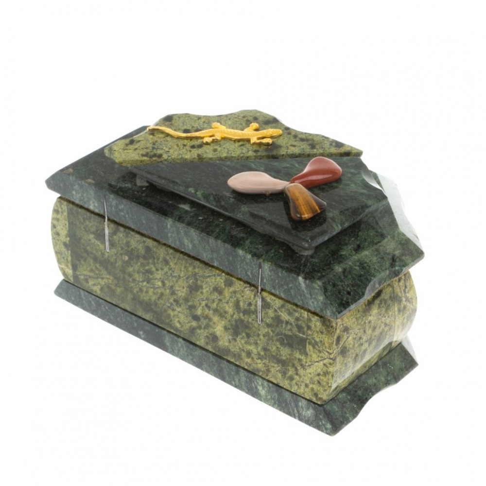Шкатулка из змеевика с ящерицей и самоцветами 15х8,5х7 см размером 15х8,5х7 см и весом 1230 г.