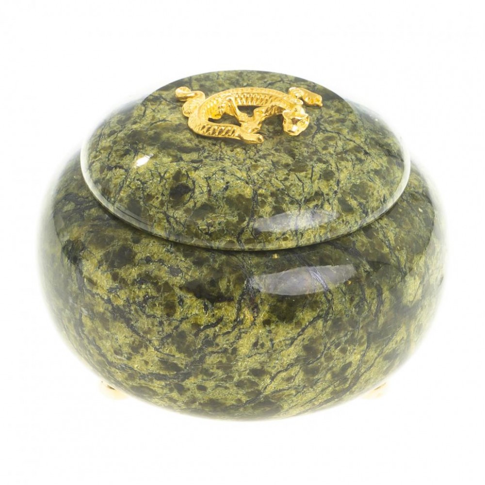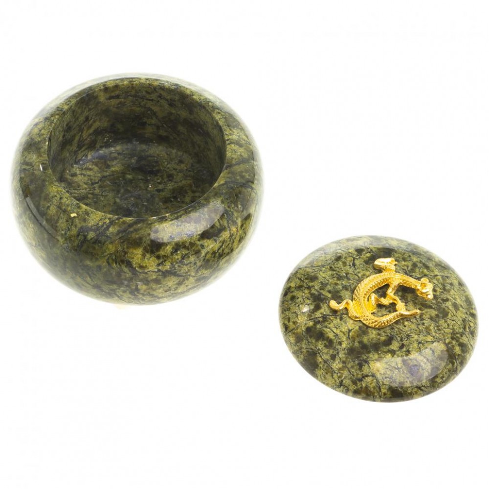 Шкатулка круглая с ящерицей камень змеевик 8х8х6,5 см размером 8х8х6,5 см и весом 450 г.