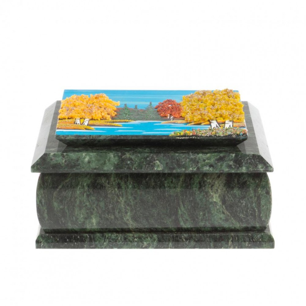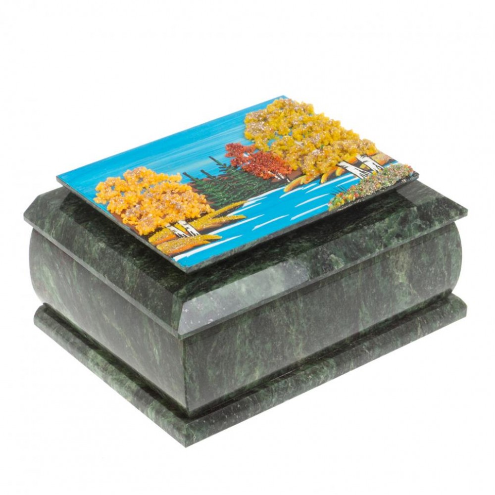 Шкатулка с рисунком "Осень" из змеевика 16х12х7,5 см размером 16х12х7,5 см и весом 600 г.