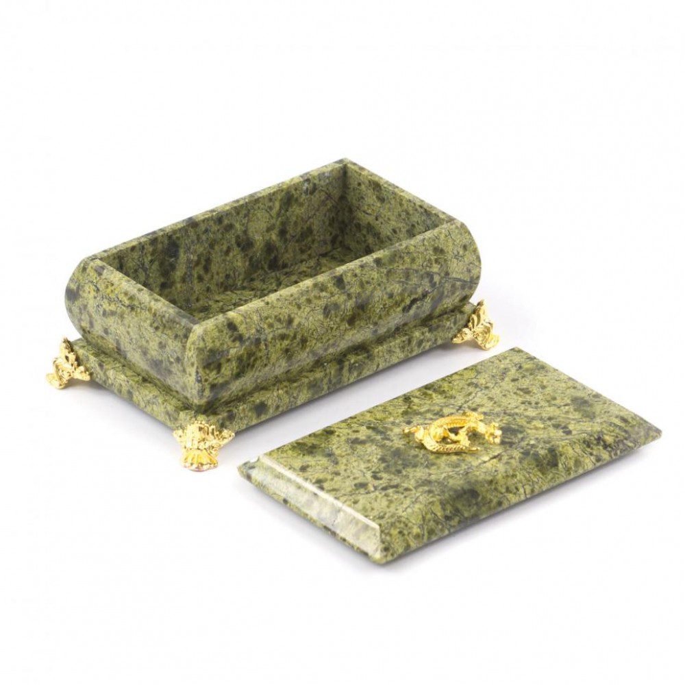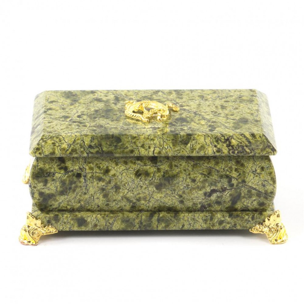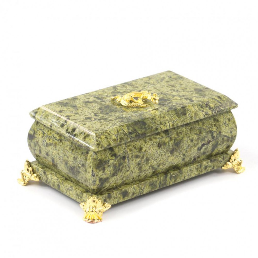 Шкатулка выполнена вручную из змеевика, имеет размеры 13х8х5 см и весит 800 г.