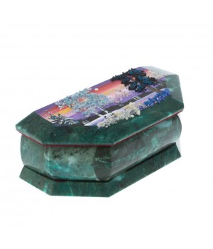 Шкатулка выполнена вручную из змеевика, каменная крошка, имеет размеры 18х9х8 см и весит 1700 г. Шка..