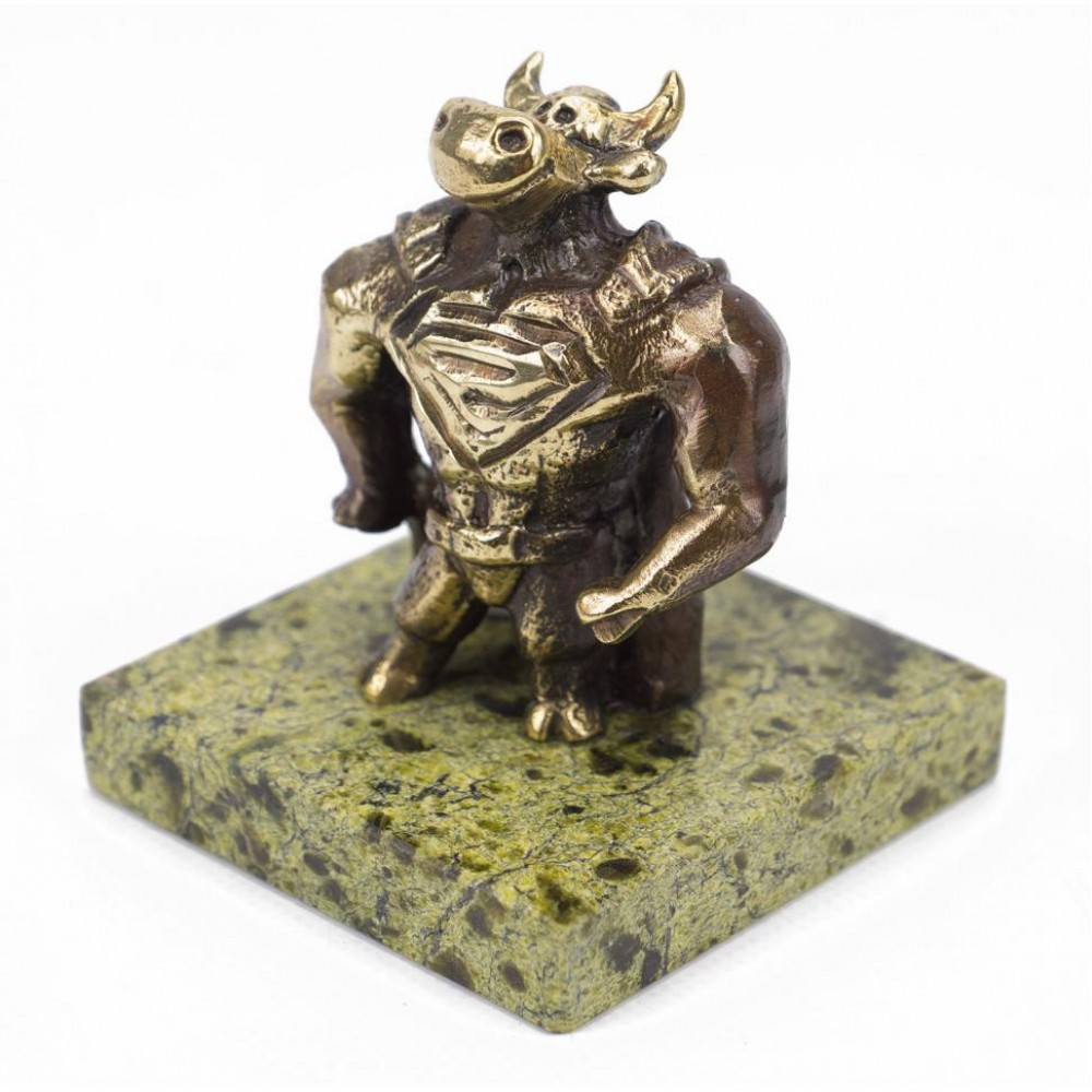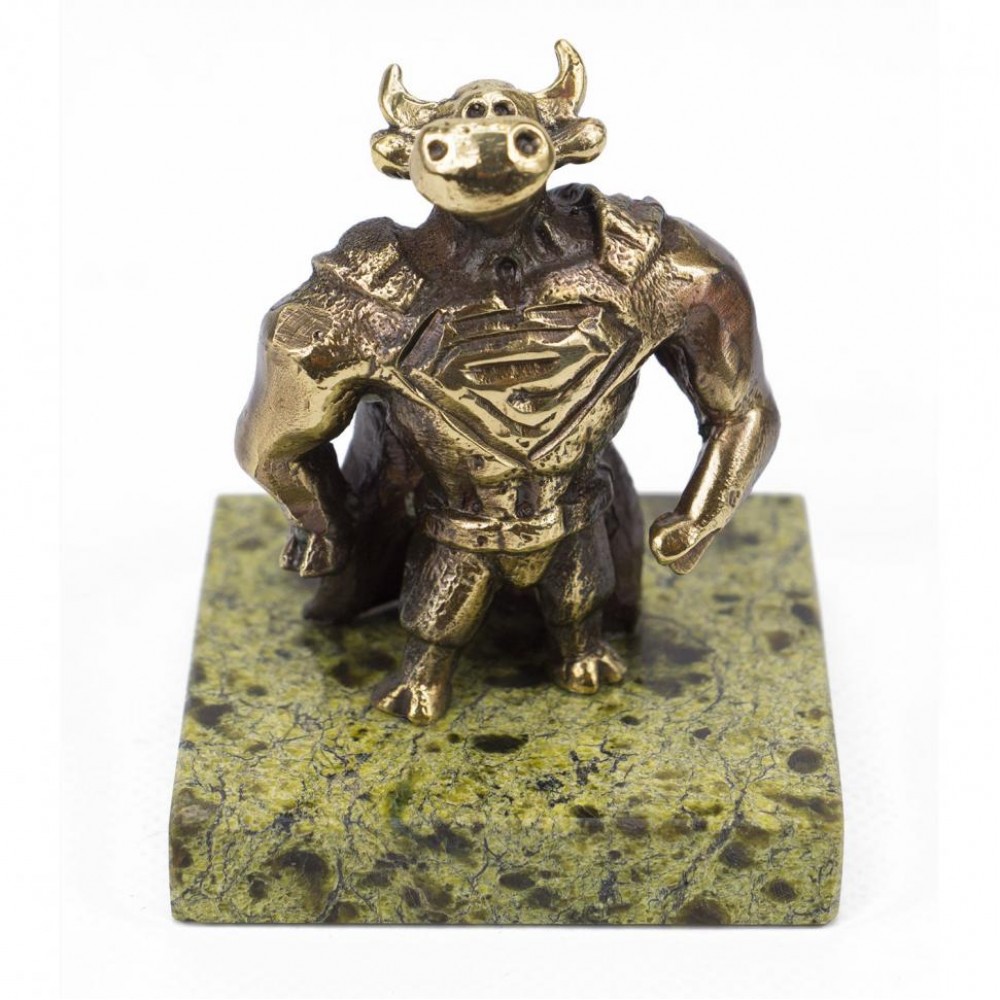 Статуэтка из бронзы "Бык супергерой" на подставке из змеевика размером 5х5х5,8 см и весом 160 г.