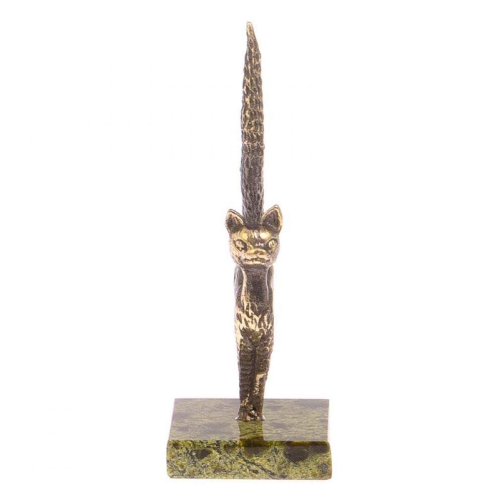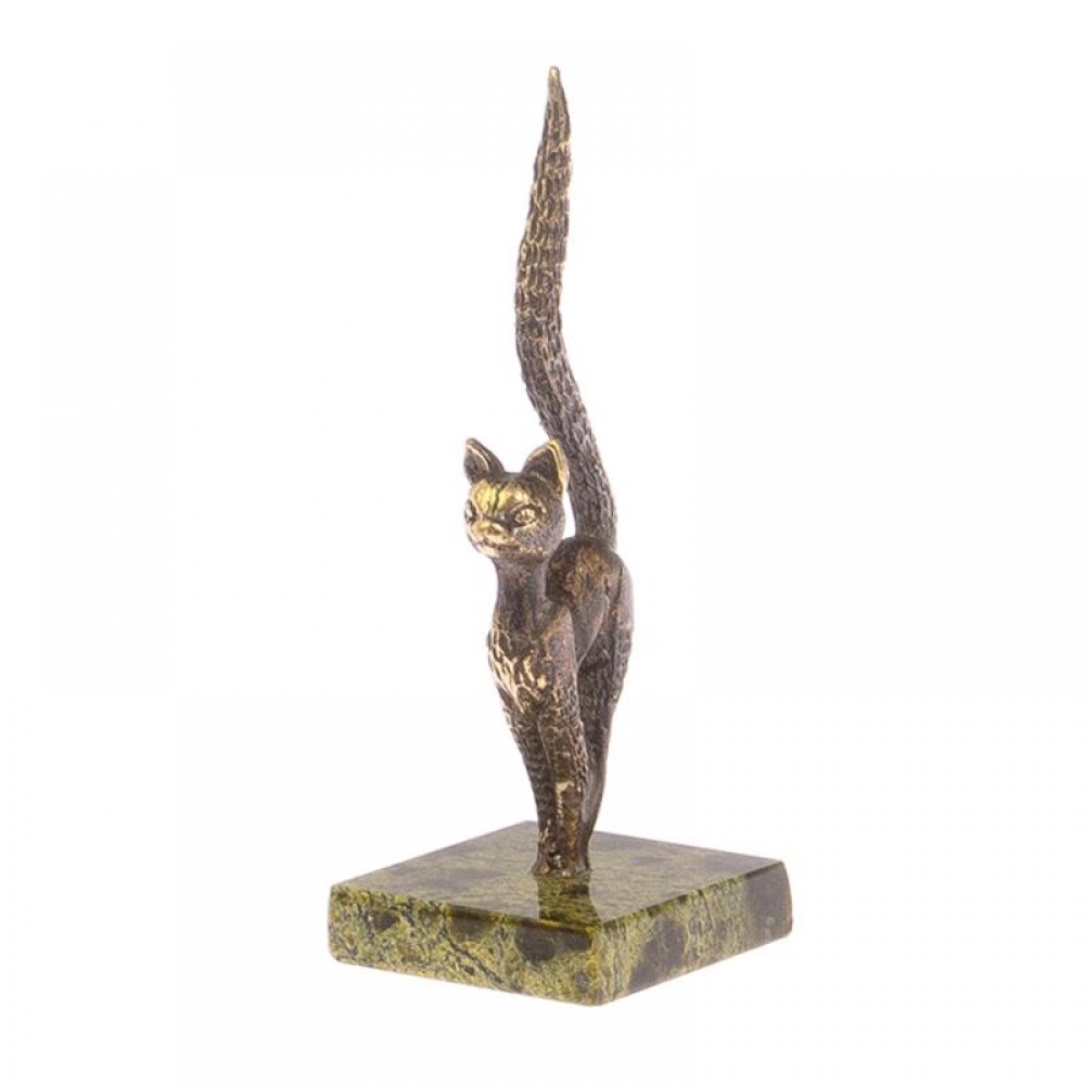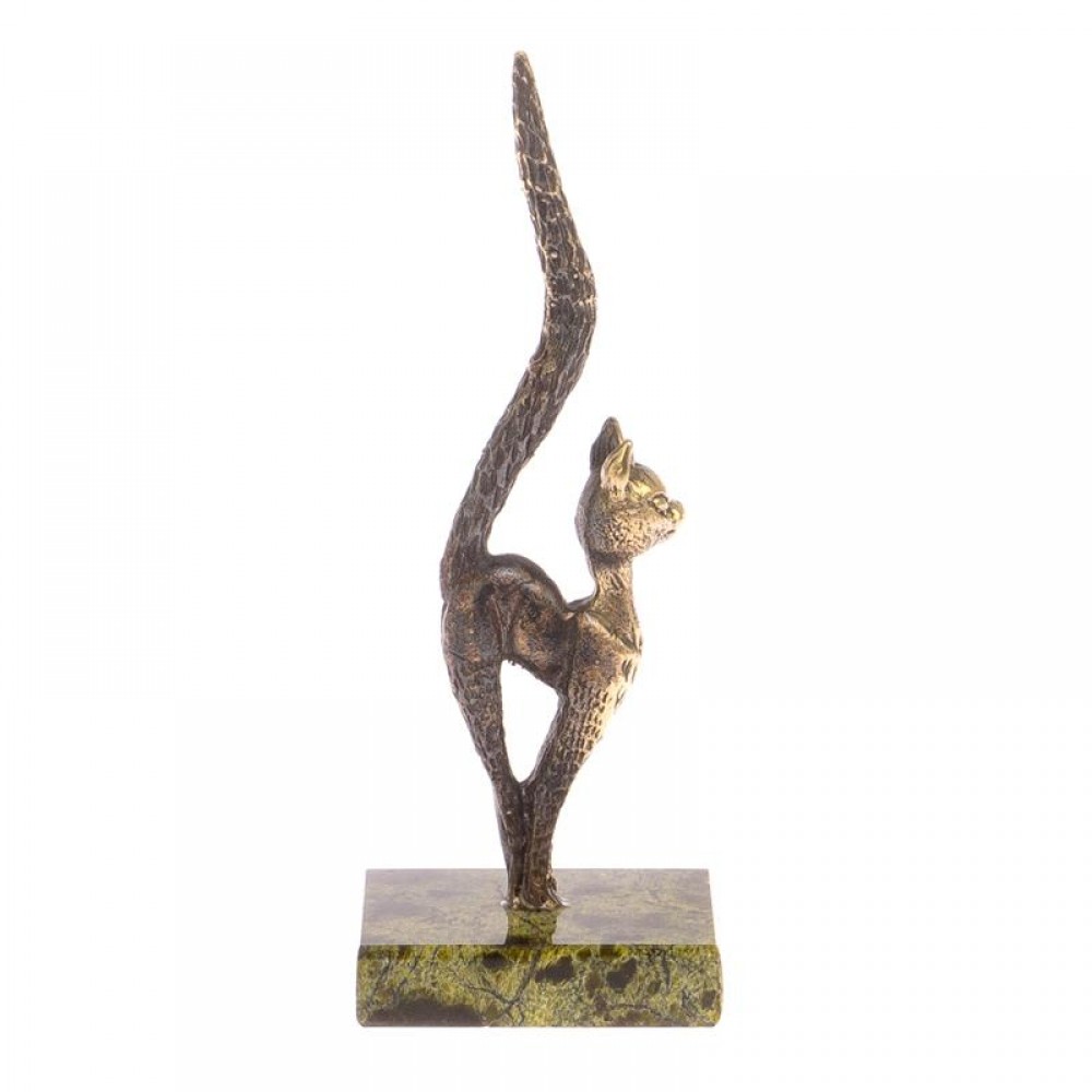 Статуэтка из бронзы "Кошка с длинным хвостом" на подставке из змеевика размером 3,5х3,5х10 см и весом 70 г.
